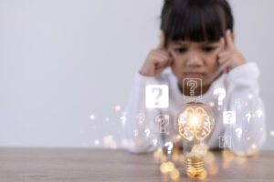 Thinking child girl with light bulb and question marks. Brainstorming and idea concept 7 July 2023 By Admin