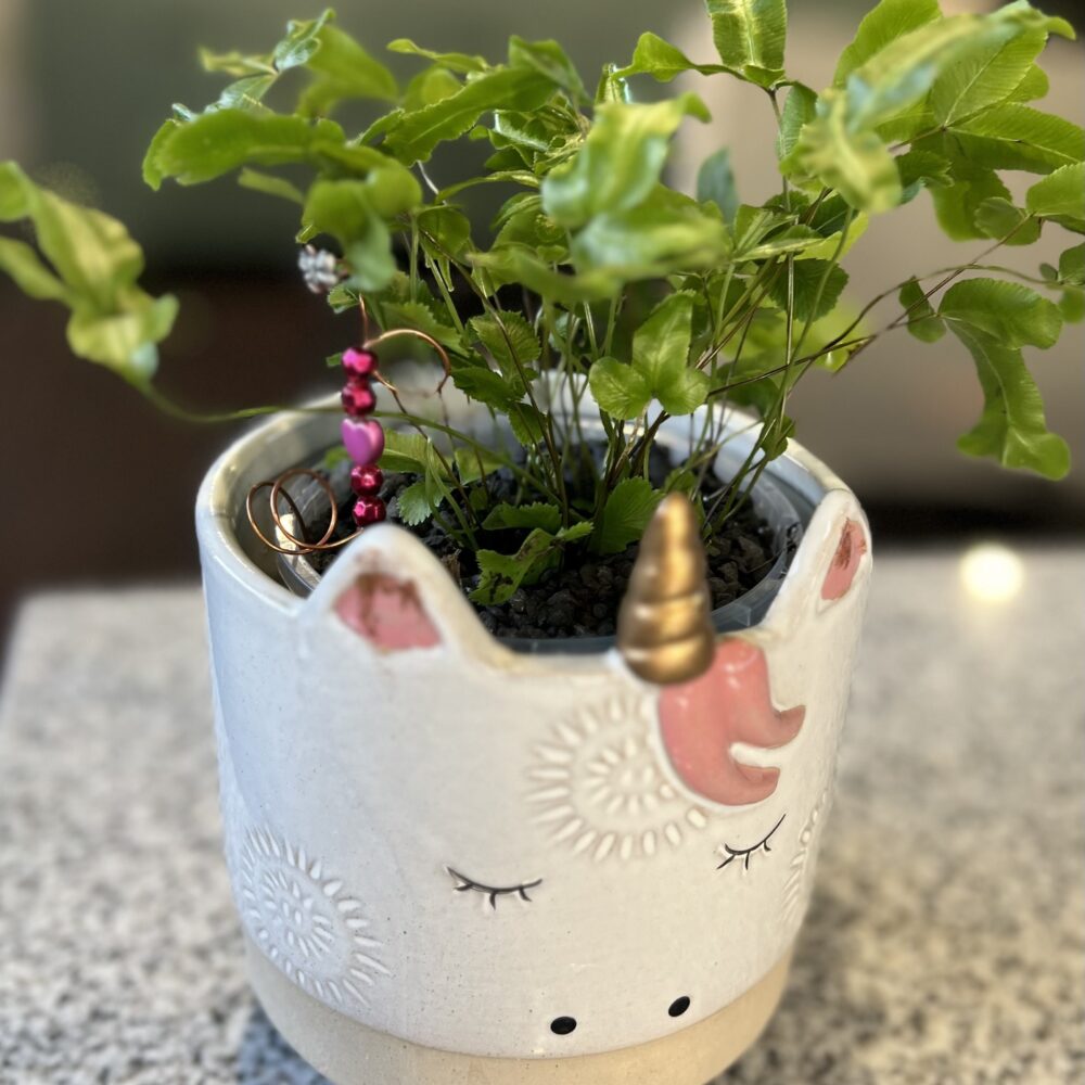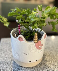 I am a Silver Ribbon Fern with a fancy name of Pteris Parkeri. Our Unicorn Fern loves the dark and has lots of friends. Only water me once a week and it’s favourite colour is Pink!
